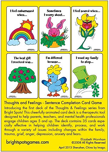 By Lisa-Marie Arneson MFT, RPT Ages: 5-12. A cheerfully animated therapeutic tool for parents or counselors designed to engage children of all ages. The deck of 38 cards is an especially effective medium in helping children identify, process, and work through a variety of issues: changes within the family system, trauma, grief, anger, depression, anxiety, and fears.